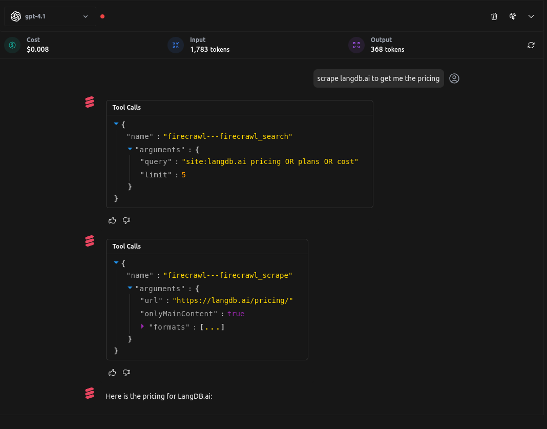 - Full Tracing: Every call is traced on the LangDB — with logs, latencies, input/output, and error metrics.