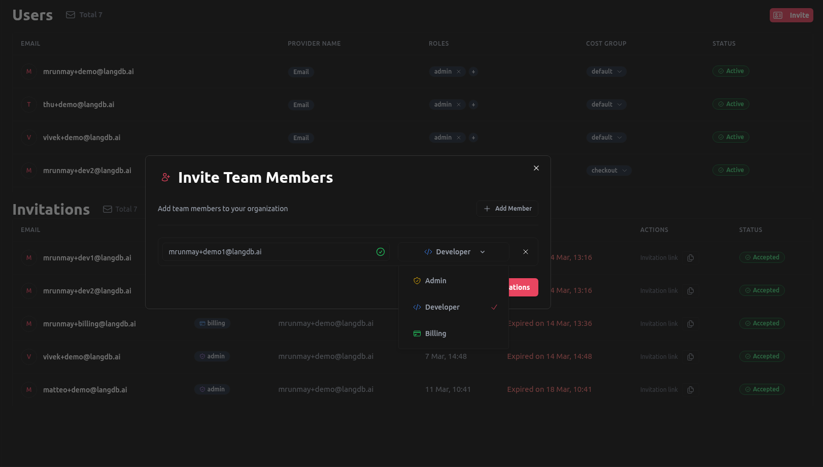 - Currently roles are managed through LangDB dashboard.