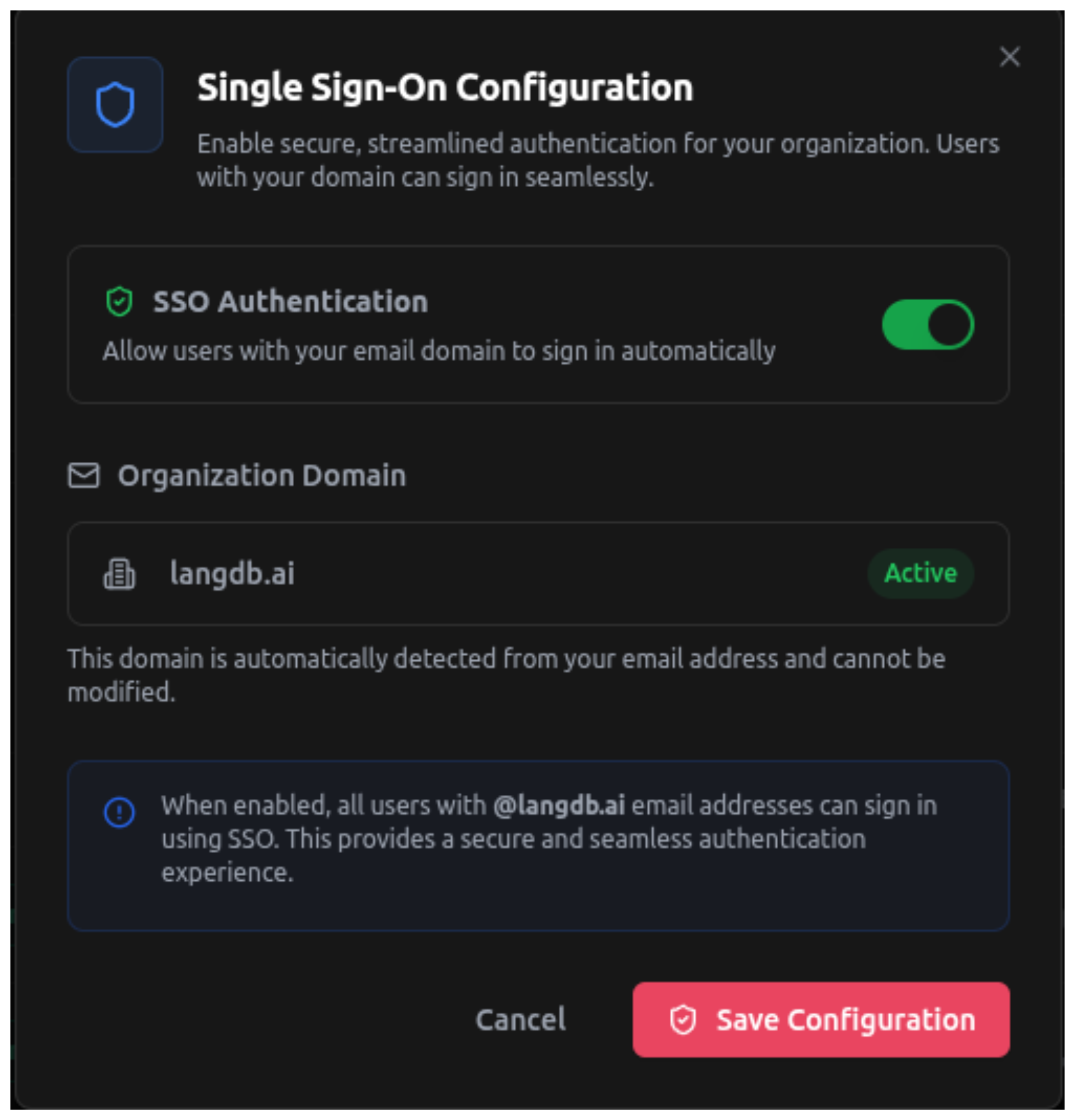 This guide will help you configure Single Sign-On (SSO) for your organization using Google Workspace. When enabled, users with your organization's email domain can sign in seamlessly using their Google accounts and will automatically be added to your organization on LangDB.