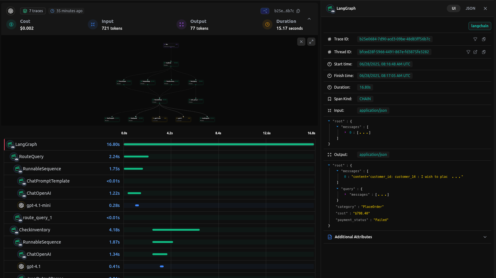 When you run queries against your agent, LangDB automatically captures detailed traces of all agent interactions: