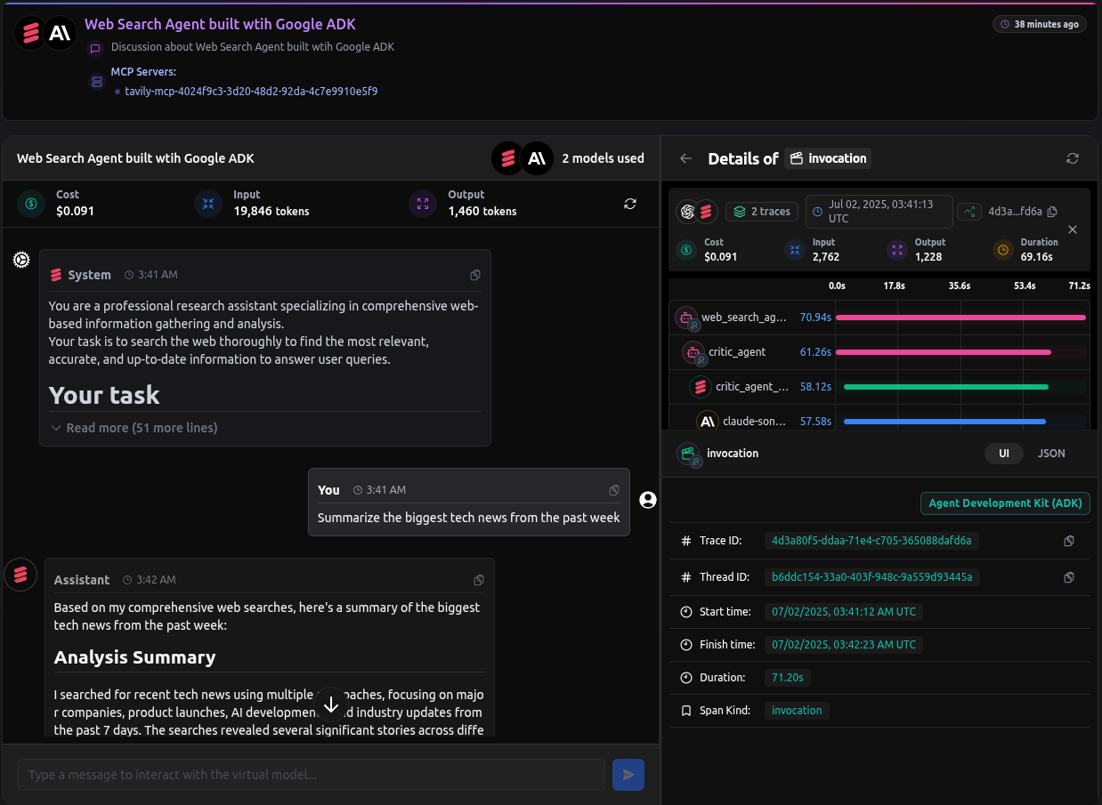 This guide walks you through setting up a powerful WebSearch agent that leverages Google ADK for orchestration and LangDB for LLM access, tracing, and flexible routing.