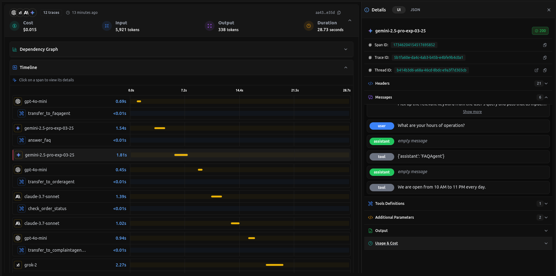 This trace graph shows a single user query routed through multiple agents, each using a different model. It captures the classifier decision, tool calls, and model usage in one place, making it easy to inspect and debug the full interaction flow.